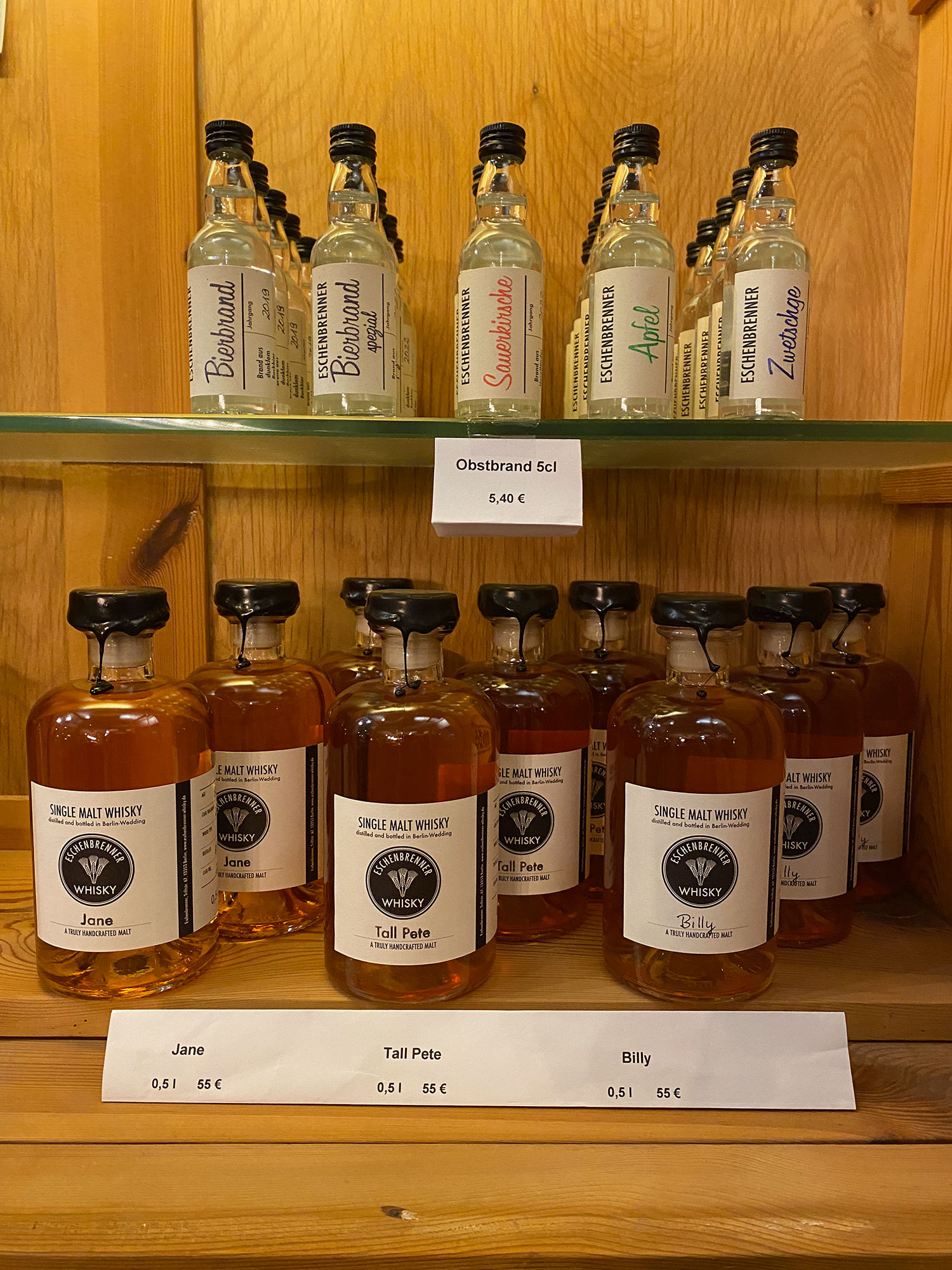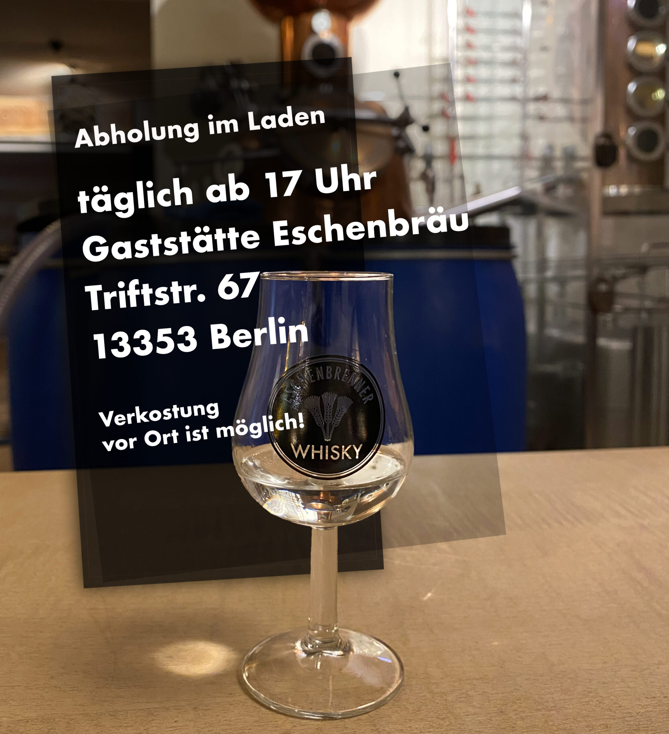 An 7 Tagen der Woche – an jedem Tag – können Sie die Eschenbrenner Whiskys und Brände in der Gaststätte Eschenbräu in Berlin Wedding selbst abholen. Ab 17 Uhr ist die Tür für Sie geöffnet. Auch die Verkostung vor Ort ist bei uns möglich.